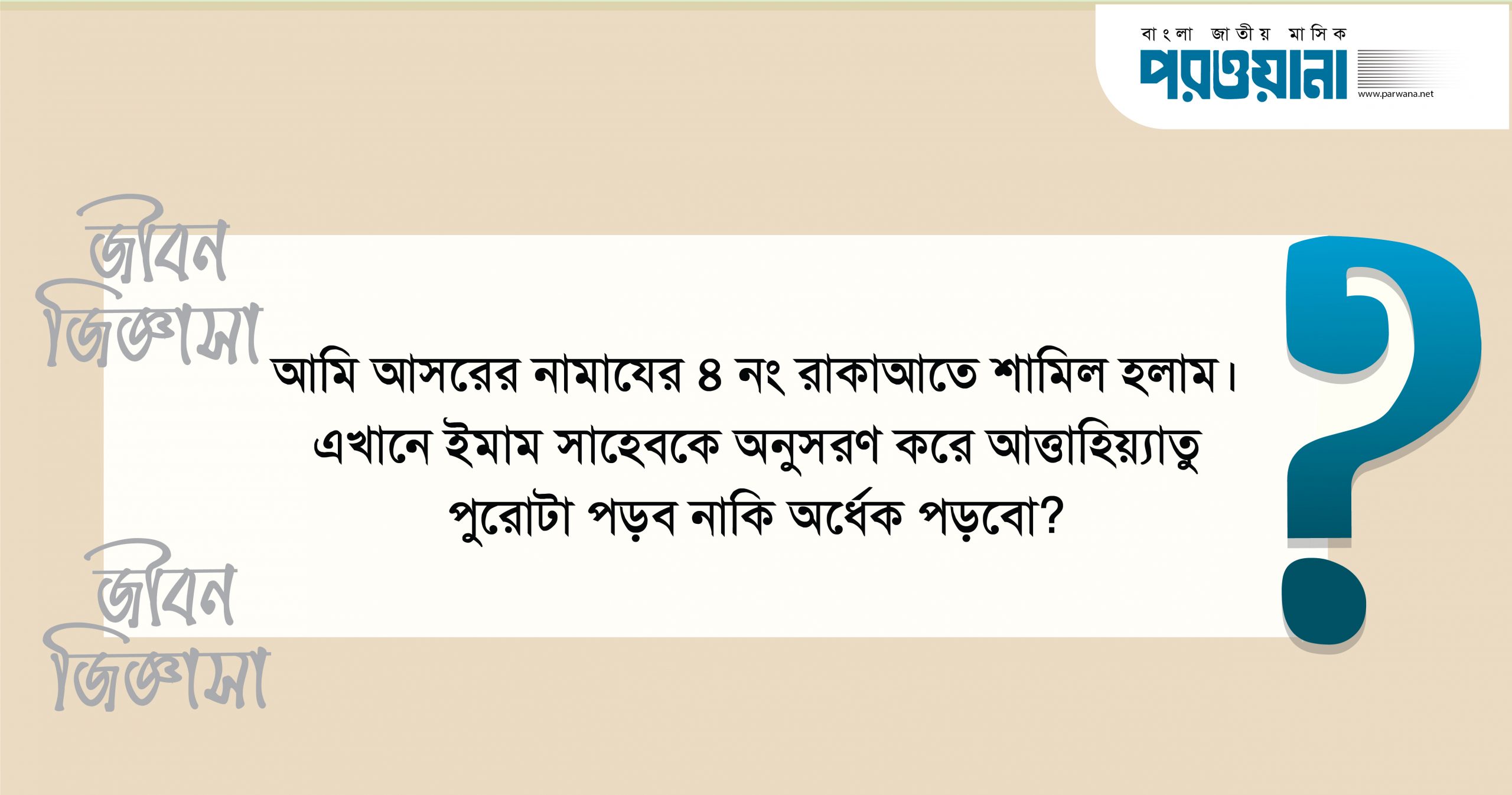 হুসাইন আহমদ রাখালগঞ্জ দারুল কুরআন ফাযিল মাদরাসা দক্ষিণ সুরমা, সিলেট প্রশ্ন: আমি আসরের নামাযের ৪ নং রাকাআতে শামিল হলাম। এখানে ইমাম সাহেবকে অনুসরণ করে আত্তাহিয়্যাতু পুরোটা পড়ব নাকি অর্ধেক পড়বো?
